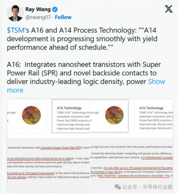 据报道称,根据 Ray Wang 透露的消息,台积电公布了其先进工艺路线图的最新进展,确认下一代 A14(1.4 纳米)工艺的研发进程顺利,其关键的良率表现已经提前达到内部预期,相较 2nm 实现重大技术升级。