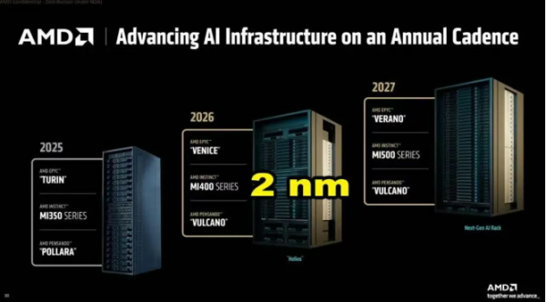 MI450将与采用台积电 3 纳米(N3P)工艺的 NVIDIA Rubin 芯片正面交锋。AMD 表示,MI450 将提供类似的 FP4/FP8 性能,但内存和带宽将增加 1.5 倍。 AMD 将使用台积电 2 纳米工艺制造 Instinct MI450 和下一代EPYC“Venice”服务器处理器,预计加速器的尺寸会更大,制造过程也会更加复杂。正如我们之前报道的那样,有可靠传言称AMD 将使用三星 HBM4内存芯片来制造 Instinct MI450 加速器——尽管 AMD 尚未证实这一点。随着年底的到来,距离 2026 年 CES 仅剩三个月,AMD 预计将于明年 1 月展示下一代 Instinct MI400 系列(甚至可能是新一代 EPYC“Venice”)。
