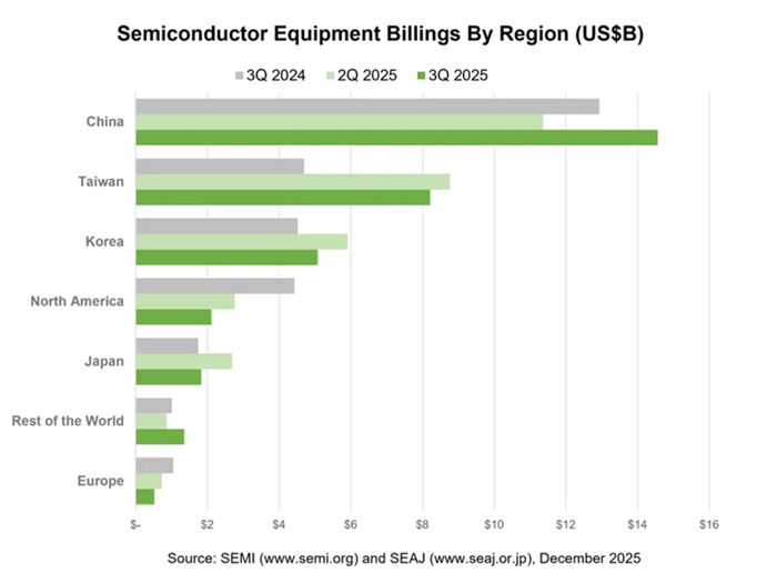 与此同时,SEMI近期发布的《全球半导体设备市场统计报告》,进一步从设备端印证了行业目前如火如荼的扩产趋势。报告表示,2025年第三季度全球半导体设备出货量同比增长11%,达到336.6亿美元。2025年第三季度出货量环比增长2%,营收增长主要得益于对先进技术的强劲投资,尤其是在人工智能计算领域领先的逻辑芯片、DRAM 和封装解决方案。此外,对中国地区的设备出货量也显著增长,进一步推动了整体的增长势头。