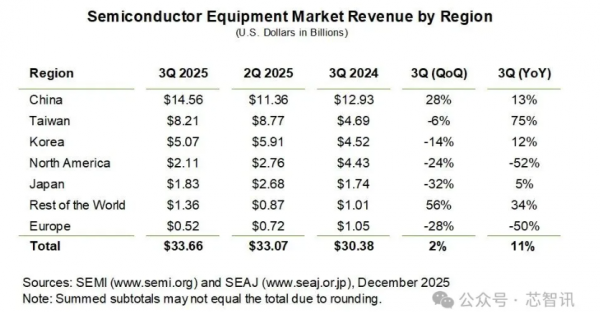 12月3日,国际半导体产业协会(SEMI)最新公布的统计数据显示,2025年三季度全球半导体制造设备销售额同比增长11%至336.6亿美元,为连续第6个季度呈现增长,增幅连续第5个季度达2位数百分比(10%以上)水准,环比销售额连续第5个季度高于300亿美元,超越2024年四季度的335.6亿美元,创有数据可供比较的2005年以来历史新高纪录。