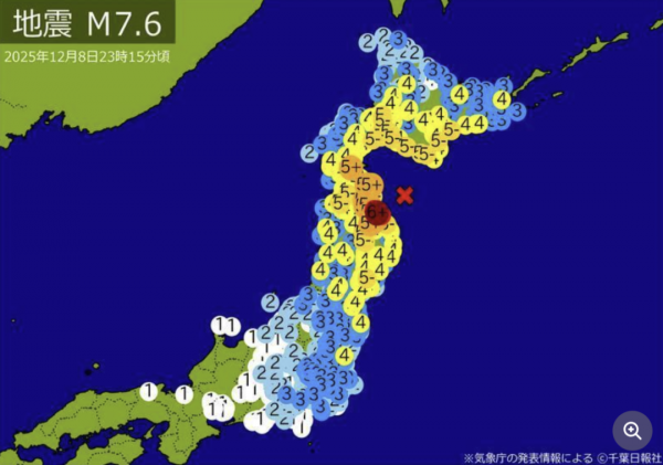 根据日本气象厅(JMA)消息,日本当地时间12月8日晚上11点15分左右,日本青森县东部海域发生里氏 7.6 级地震,震源深度约为50公里,引发青森县八户市发生日本震度等级6级以上的地震,青森县、岩手县和北海道沿海地区海啸预警。