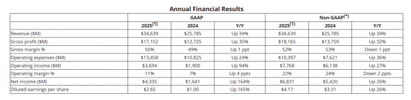 2025财年,AMD营收346亿美元,同比增长34%,创历史新高纪录;营业利润为78亿美元;净利润(Non-GAAP)68.3亿美元,同比增长26%;EPS 则为4.17 美元。