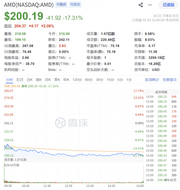 由于第一季财测指引不够强劲,再加上对于来自中国市场数据中心业务营收的大幅下滑,导致AMD股价在盘后大跌,2月4日的美股交易当中更是暴跌17.31%。