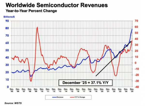 2026年2月6日,半导体行业协会(SIA)宣布,2025年全球半导体销售额已达7917亿美元,较2024年的6305亿美元增长了25.6%。其中,2025年第四季度销售额为2366亿美元,同比大涨37.1%,环比增长13.6%。2025年12月全球销售额为789亿美元,较2025年11月增长2.7%。