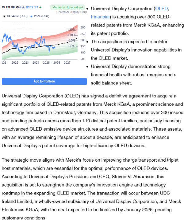 该交易将由Universal Display Corporation的全资子公司UDC Ireland Limited与Merck Electronics KGaA执行,预计将于2026年1月完成,但需满足惯例成交条件。