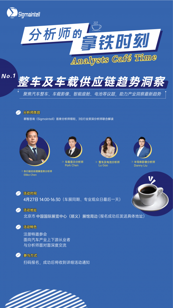 以咖啡为媒,围坐畅谈,群智咨询(Sigmaintell)资深分析师团队带你一起洞察汽车整车、智能驾驶、智能座舱、电池能源等议题新趋势,在松弛氛围中深度碰撞与交流。